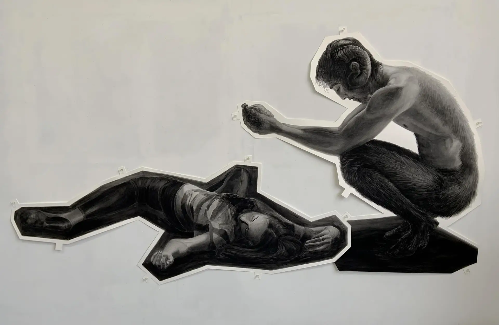 Artworks by 11 invited artists were showcased around a dining table where a four course carnivorous banquet, made by award winning Chef Emma James, was served based around the notion of roadkill.