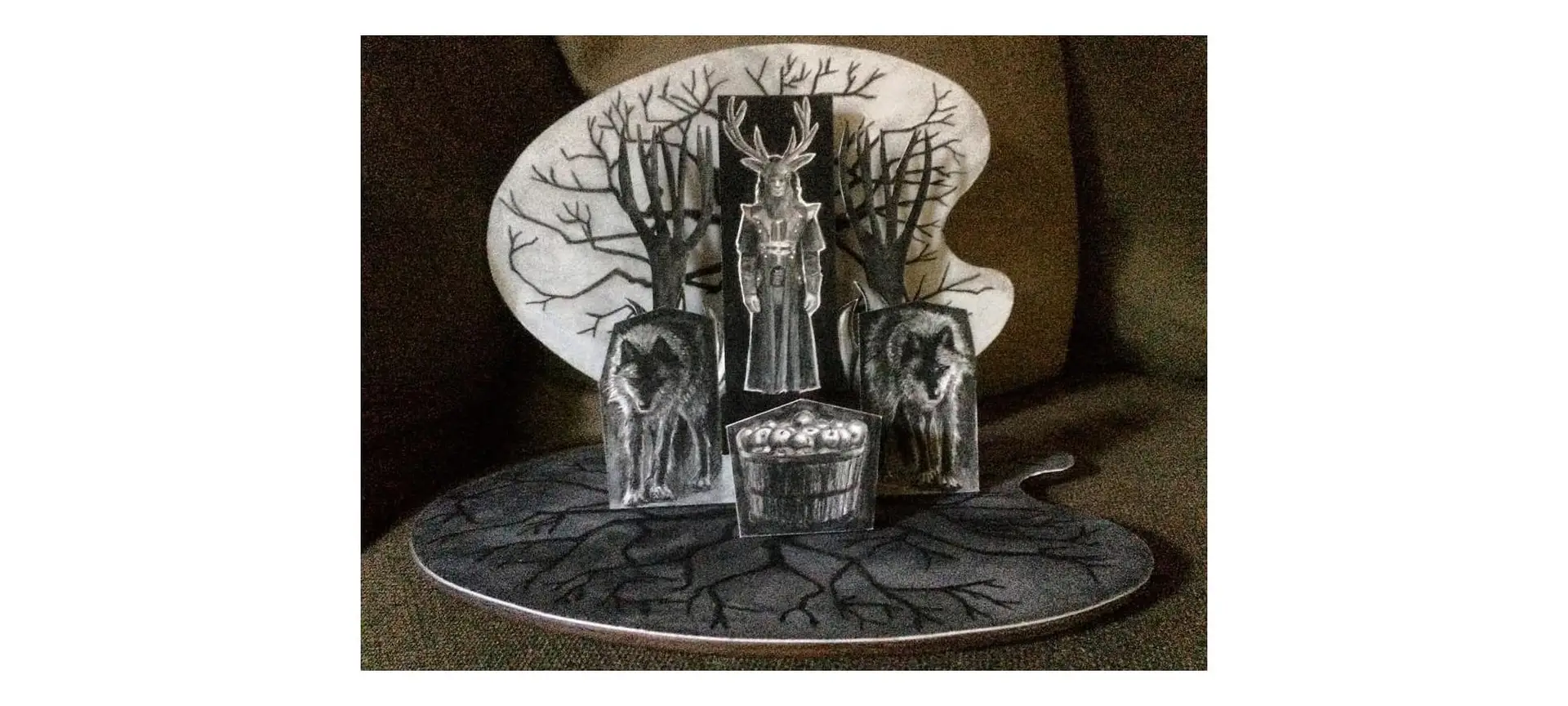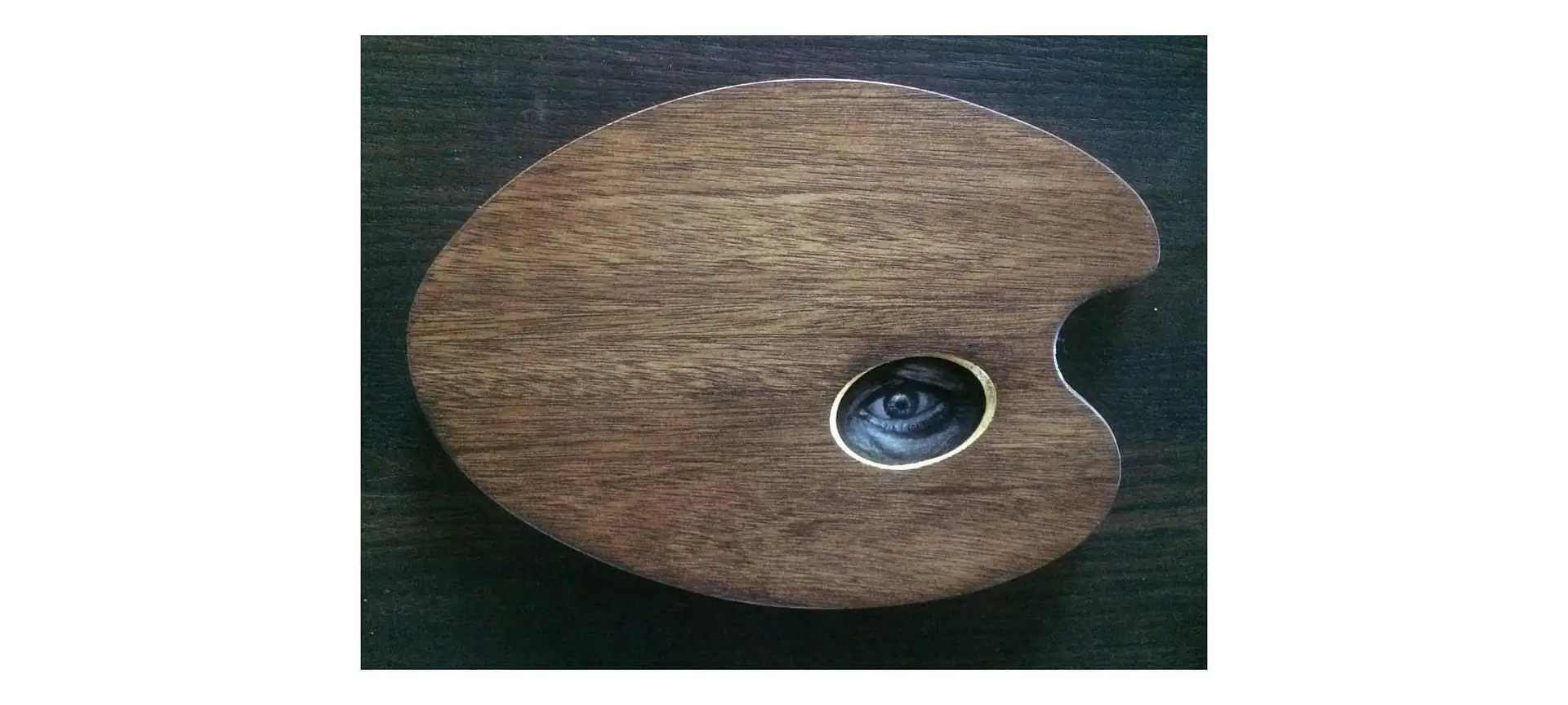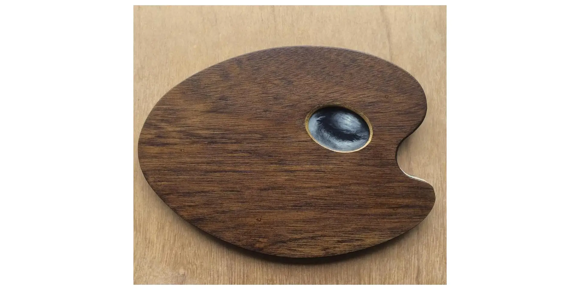 This is made from two artist palettes joined with tiny cabinetry hinges, to open and reveal a pop-up display. The thumb holes are lined in gold leaf on the outside.
